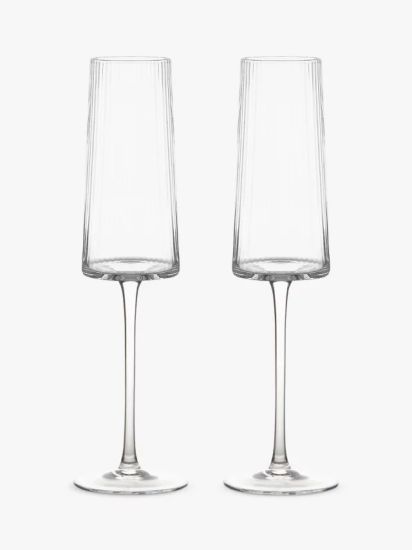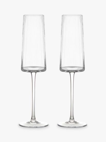 Hand-blown, this pair of champagne glasses with fluted optics has an elegant and modern shape.