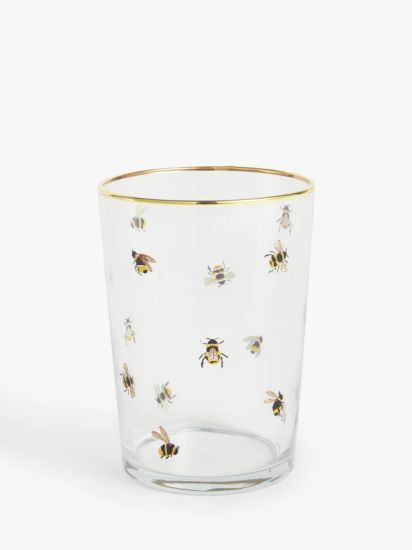 • A perfect choice for nature lovers, this tumbler features a buzzing bee. Perfect for soft drinks and cocktails, this tumbler features a screen-printed design on sturdy glass and a shiny metal rim.